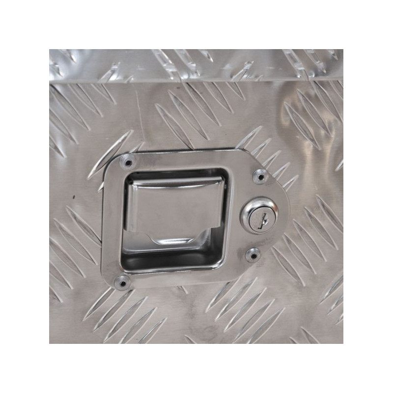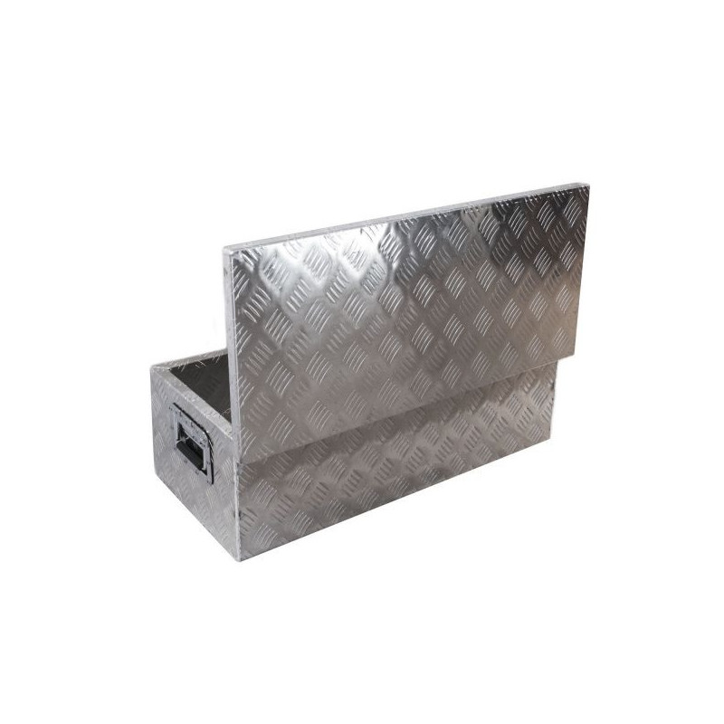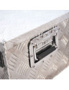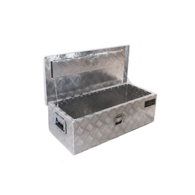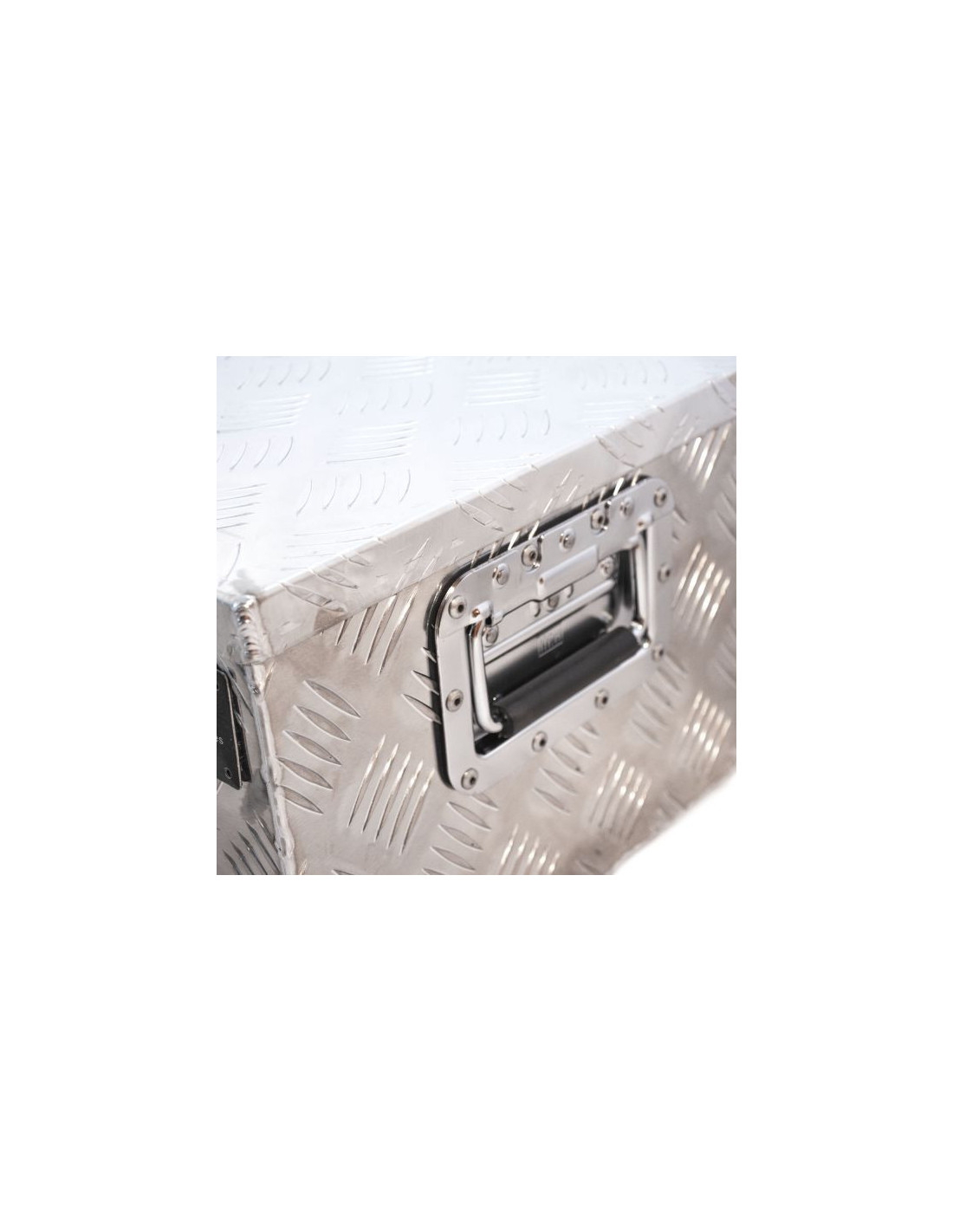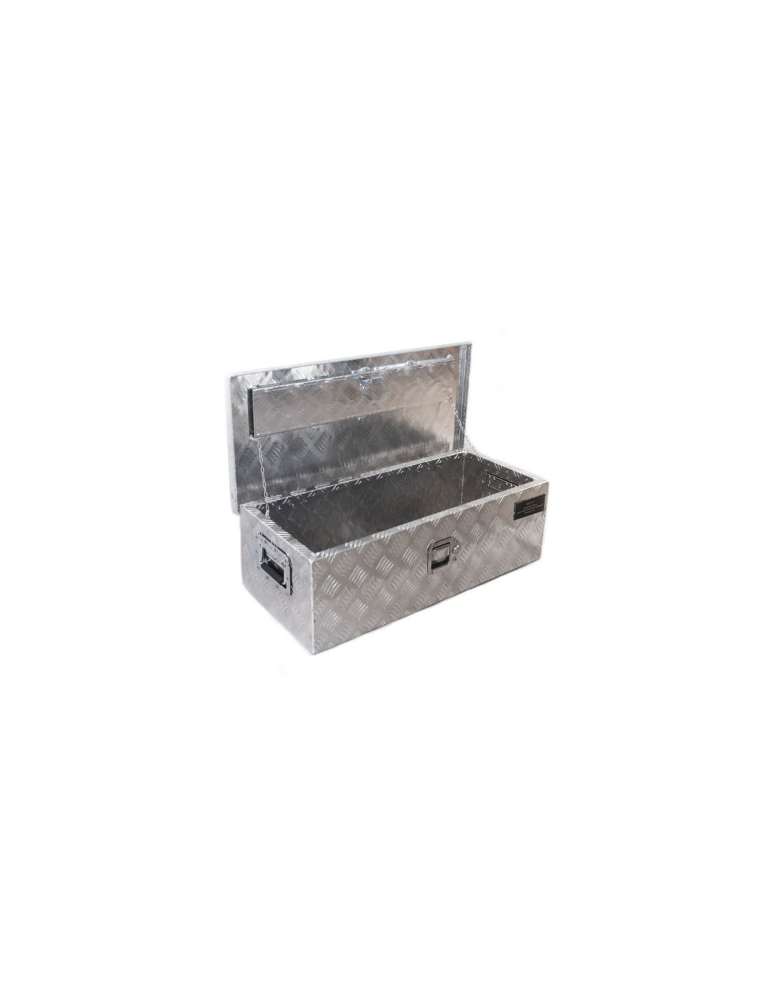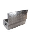 Coffre ouverture dessus 775x355x250 mm Caractéristiques du coffre :- 2 chaines de maintien pour le couvercle- Fermeture réf. 00708 avec 2 clés fournies- 2 poignées rabattables à bride ( Réf. 00304 )- 1 charnièreInfos techniques : - Dimensions passage couvercle (L x l) : 690 x 260 mm- Dimensions intérieur utile (L x l x H) : 690 x 260 x 210 mm- Dimensions extérieures (LxPxH) : 775 x 355 x 250 mm - Matériau : Aluminium strié 1,5 mm - Usage : Ouverture dessus (sur le timon de remorque, sur un rail porte vélo, à l'arrière d'une benne de pick up)- Poids : 6,5 kg