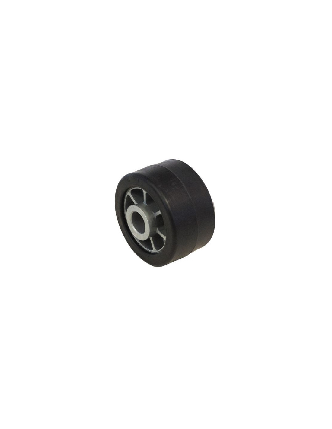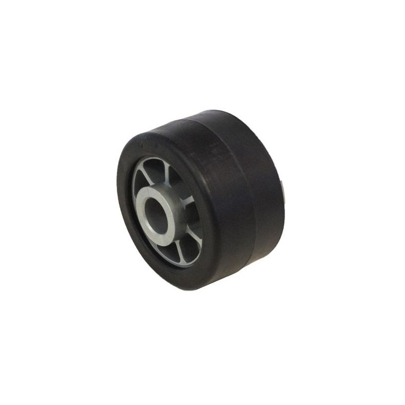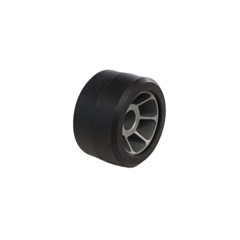 Galet bi-matière blanc/rougeCaractéristiques :- Diamètre : 90 mm- Largeur totale : 53 mm- Largeur bande de roulement : 45 mm- Alesage : 21mm- Longueur de l'axe : 43 mm- Poids : 0,222 kg