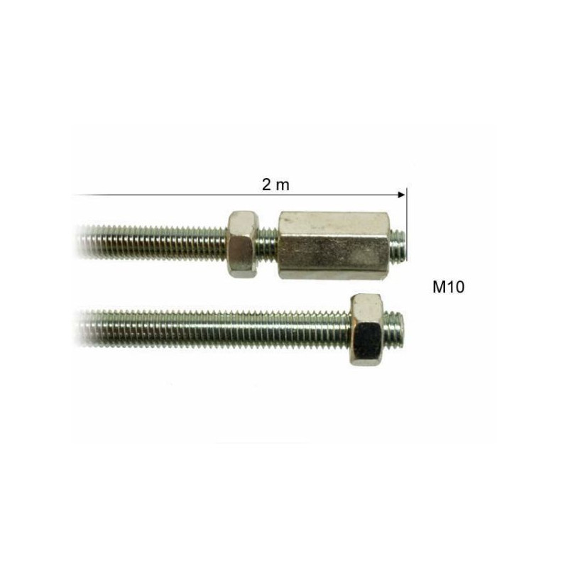 Tige filetée pour palonnierlivrée en 2 parties de 1 mètre avec ecrou pour faire le bout à bout total de 2 mètres 2x1mCaractéristiques :- Tringle de frein avec 2 ecrous et rallonge M10- Se place en continuité de la bielle de tête d'attelage et va vers le palonnier- 2 tiges d'1 mètre chacune avec ecrou rallonge et écrou frein